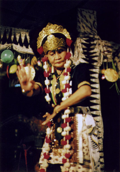 Tari Topeng yang dipertunjukan oleh Mimi Rasinah dalam acara Temu Maestro Rasinah dan Jeihan di Cafe Toko You Bandung Jawa Barat ca. 2005