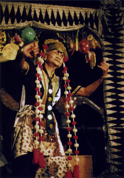 Tari Topeng yang dipertunjukan oleh Mimi Rasinah dalam acara Temu Maestro Rasinah dan Jeihan di Cafe Toko You Bandung Jawa Barat ca. 2005