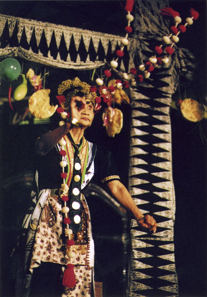 Tari Topeng yang dipertunjukan oleh Mimi Rasinah dalam acara Temu Maestro Rasinah dan Jeihan di Cafe Toko You Bandung Jawa Barat ca. 2005