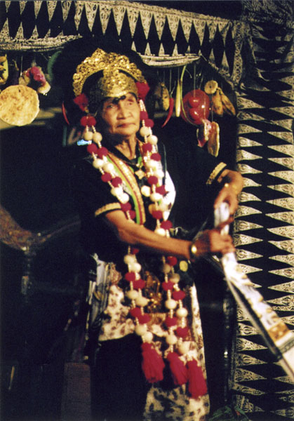 Tari Topeng yang dipertunjukan oleh Mimi Rasinah dalam acara Temu Maestro Rasinah dan Jeihan di Cafe Toko You Bandung Jawa Barat ca. 2005