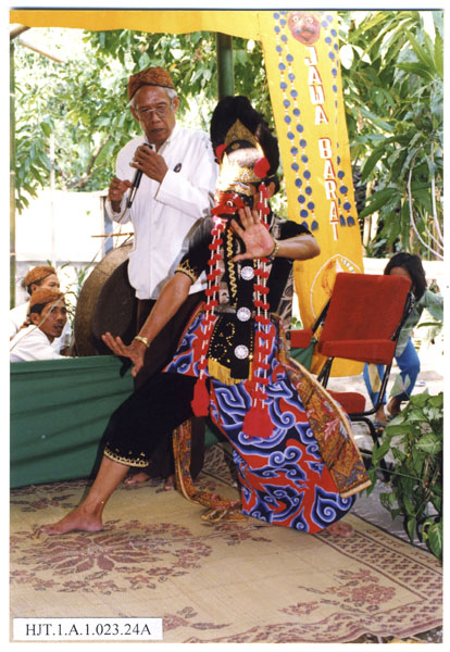 Pak Jana menari Topeng Klana dalam acara Seni Tari Topeng Gaya Klasik Cirebon Panji Asmara Pimpinan Sujana Arja Putra di desa Slangit Kecamatan Klangenan kota Cirebon Jawa Barat.
