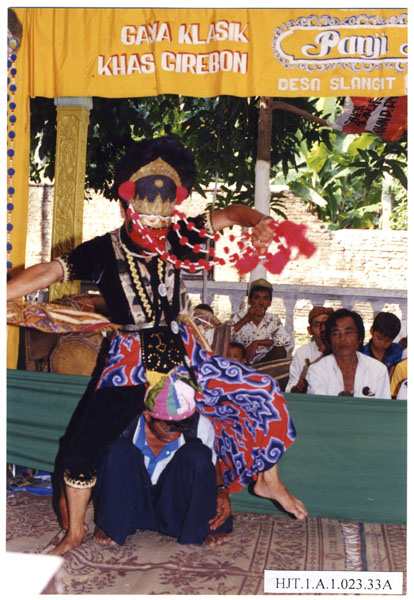 Pak Jana menari Topeng Klana dalam acara Seni Tari Topeng Gaya Klasik Cirebon Panji Asmara Pimpinan Sujana Arja Putra di desa Slangit Kecamatan Klangenan kota Cirebon Jawa Barat.