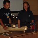 Endo Suanda dan Waridi mengamati kecapi bambukarya peserta dalam Pelatihan PSN topik "Alat Musik Dawai" pada Agustus 2005