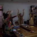 Putu Wijaya (memakai topi putih) memberikan pelatihan mengolah nafas kepada para peserta yang terdiri atas guru-guru SMA j