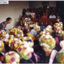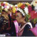 Kasinoman Wadon mengenakan kostum dengan hiasan bunga di kepalanya dalam upacara Ngarot di Desa Lelea Kabupaten Indramayu