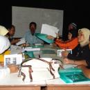 Kelompok peserta berdiskusi menyusun silabus topik "Tari Komunal" dalam Pelatihan Guru PSN pada 4-8 Agustus 2005 di Bandun