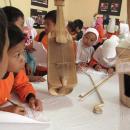 Para siswa SD dari Bandung mengamati dan mencatat keterangan yang tertera pada instrumen tarawangsa koleksi LPSN yang dipa