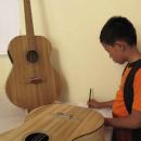 Para siswa SD dari Bandung mengamati dan mencatat keterangan yang tertera pada instrumen gitar bambu koleksi LPSN yang dip